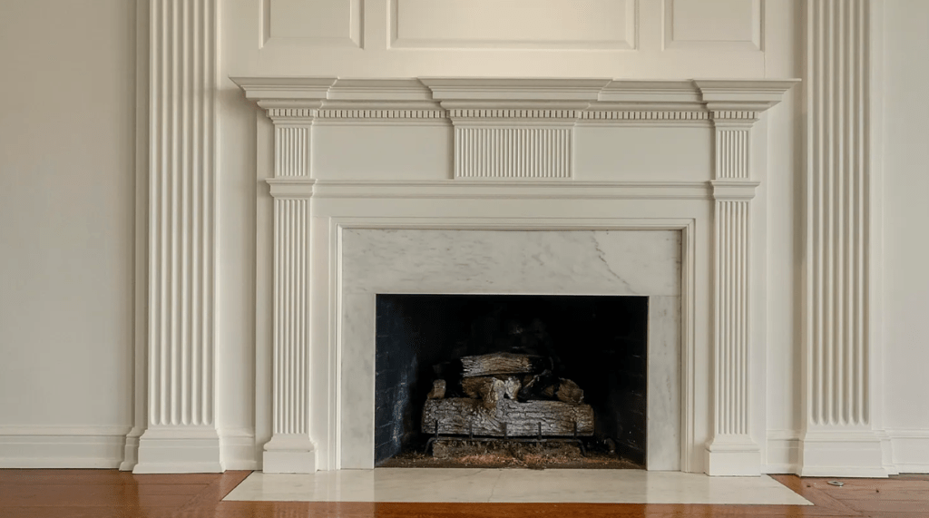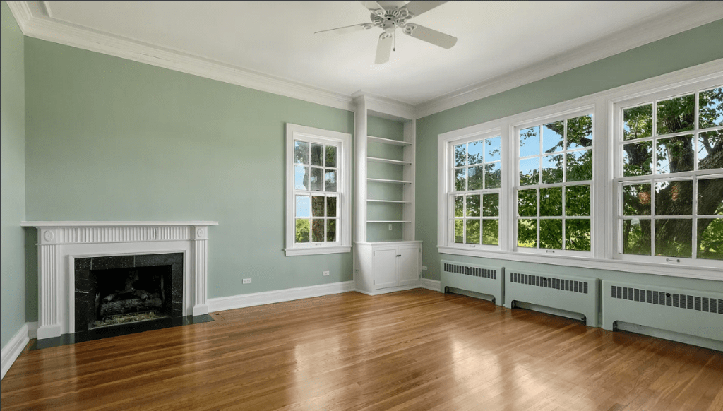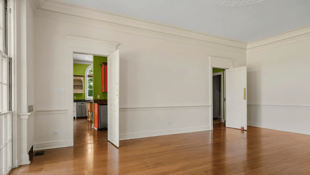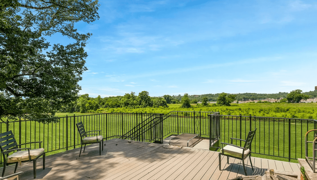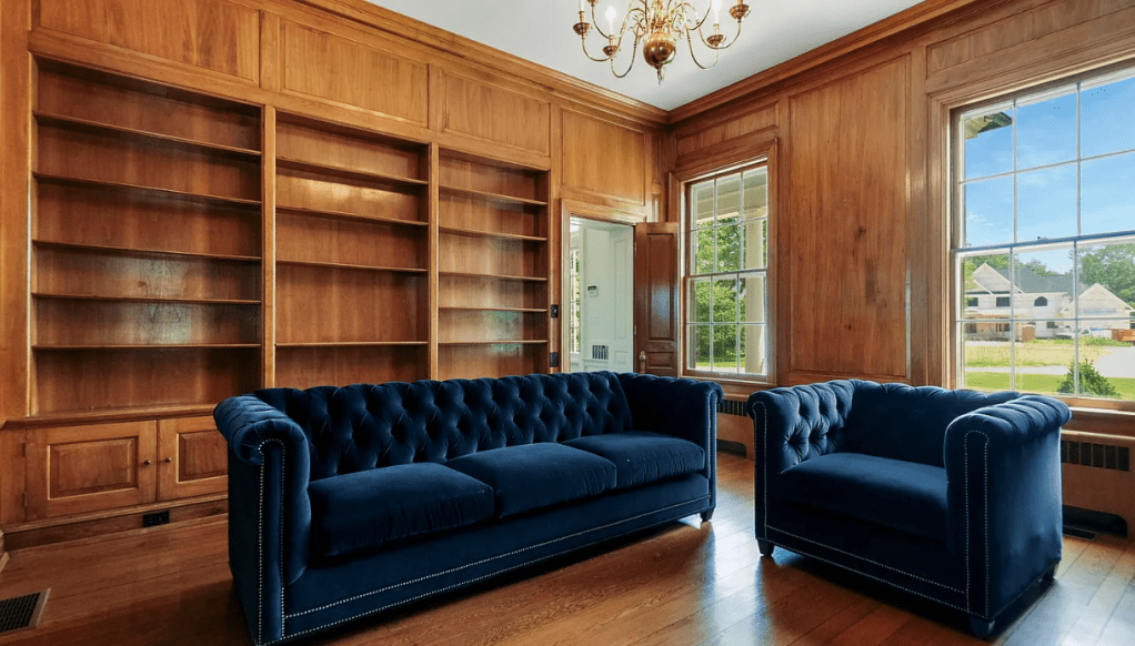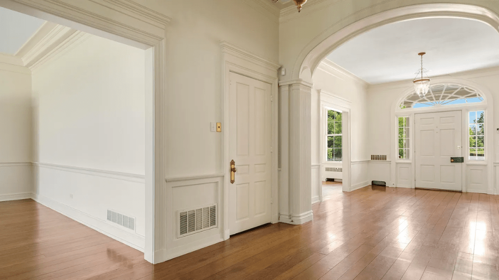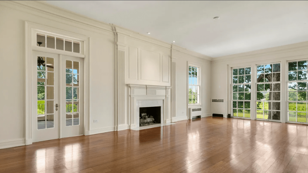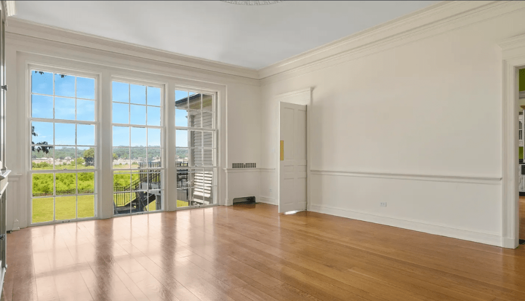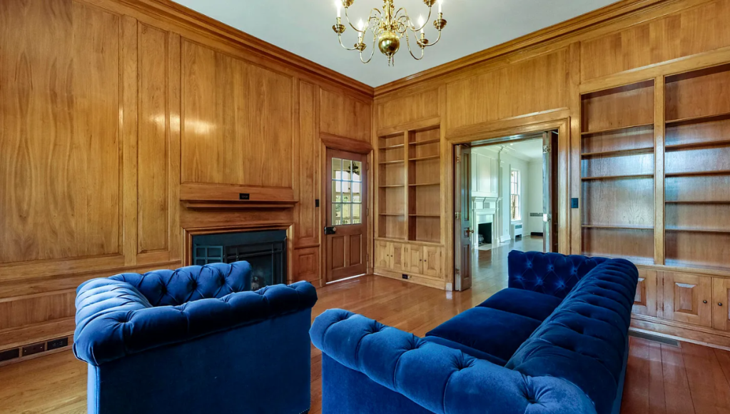 “Rich in history with original door handles and hardwood floors, you will also find 12 ft ceilings on the main and upper floors, large windows overlooking the river in all outer rooms that allow natural lighting throughout every floor. There’s an elevator, a library with a fireplace, a sunroom, a butler’s pantry, a marble-floored bathroom, and balconies with sweeping river views. The slate roof, black fencing, and circle drive add curb appeal, while the kitchen porch with an outdoor fireplace invites you to stay a while.”